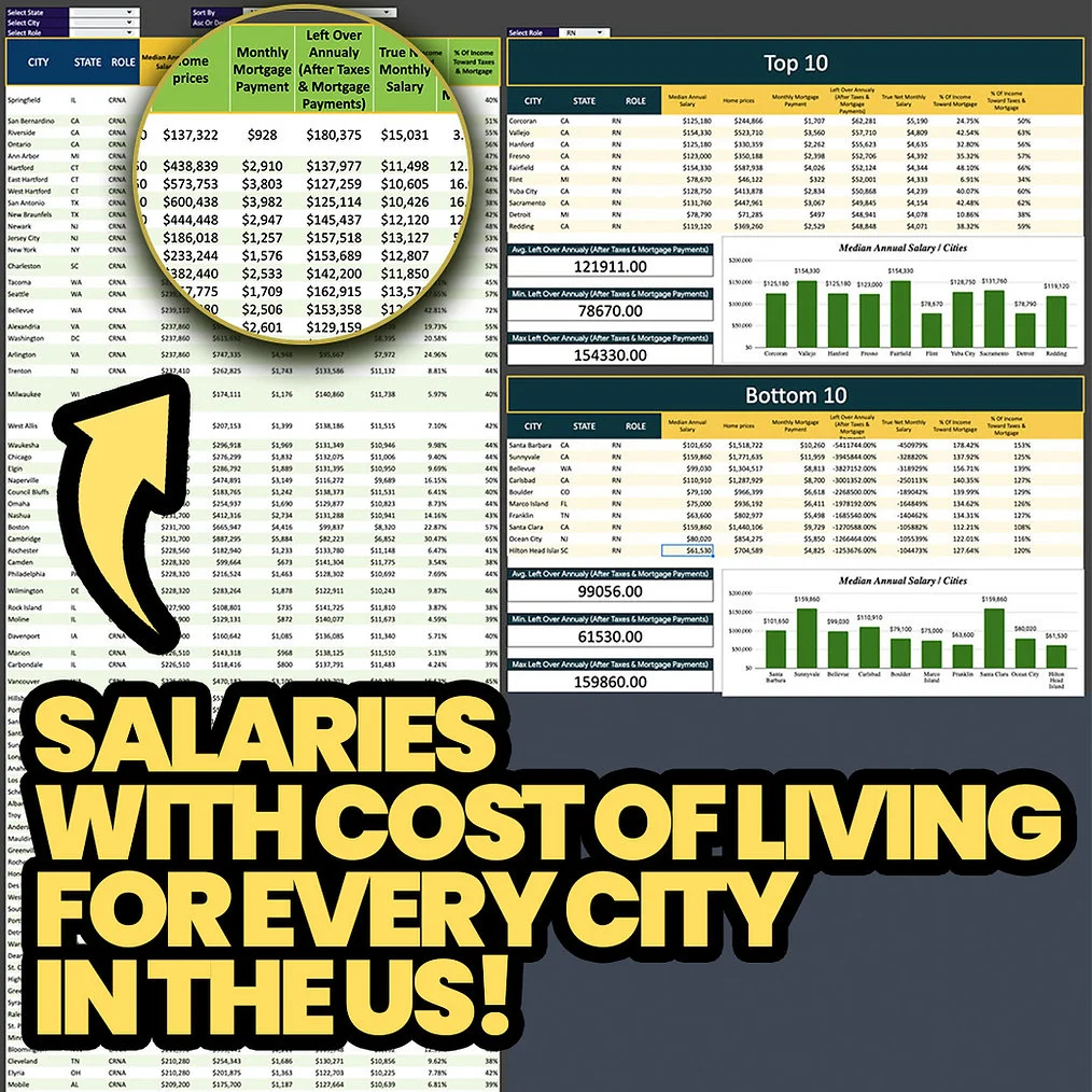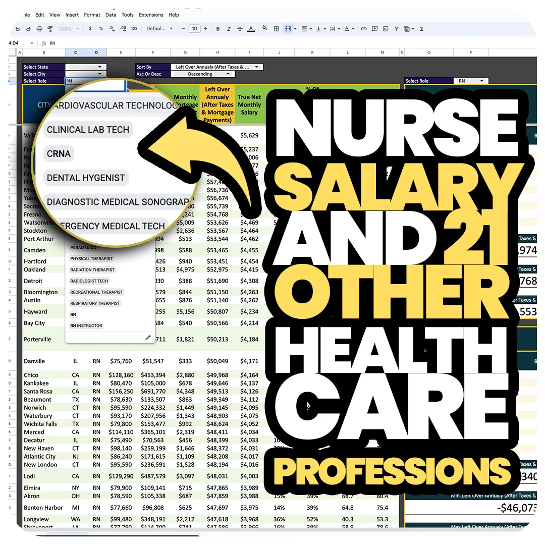 Financial freedom is crucial for healthcare professionals. That’s why I’ve designed our spreadsheets to help you achieve your financial goals. Our comprehensive salary data can help you negotiate a higher salary or find a job in a city with a lower cost of living. With the Ultimate Salary Spreadsheet for Nurses (and soon other healthcare professionals), you can take control of your financial future.