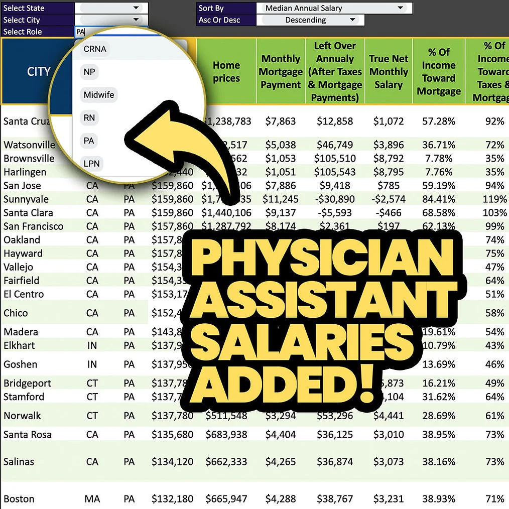 Our spreadsheet goes above and beyond other salary data resources by offering customizable filters and sort options. You can sort by median salary, home price, mortgage payment, net income, and more!
